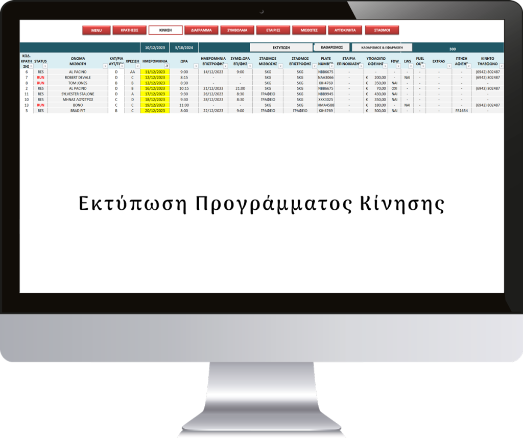 Όλα τα παραπάνω μεταφέρονται αυτόματα από τις Κρατήσεις και εμφανίζονται με ταξινόμηση ημερομηνίας και ώρας Παράδοσης και Παραλαβής.