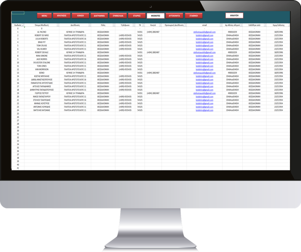 Σε μορφή πίνακα καταχωρούνται τα πλήρη στοιχεία των Μισθωτών. Σε αυτά περιλαμβάνονται: